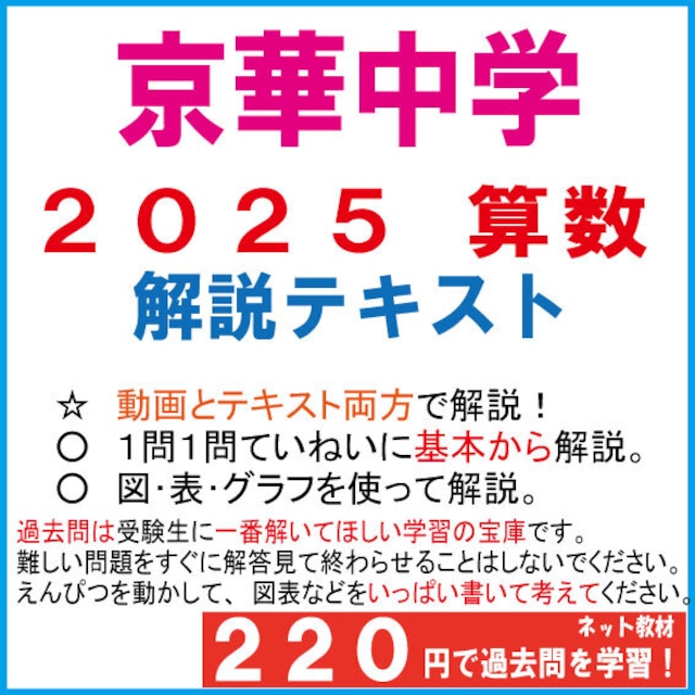 2025年度 京華中学の算数過去問解説テキストを1問ずつ丁寧に解説しました。 このテキストでは、京華中学の算数の過去問を1問ずつ解いており、受験を目指す方や算数の基礎をしっかりと学びたい方に最適な内容となっています。特に、視認性を重視し、文字は大きく、わかりやすい説明を心掛けています。 また、解き方がわからない問題がございましたら、YOUTUBEで動画にして解説する予定ですので、ぜひお気軽にご連絡ください! メール: [email protected]