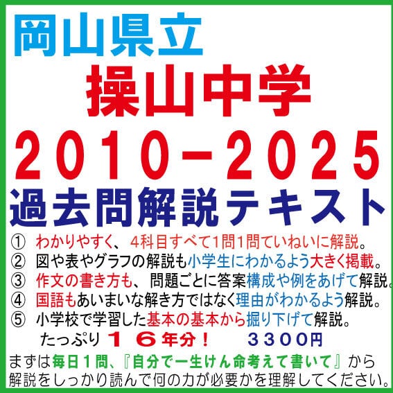 岡山県立操山中学の過去問解説テキスト、第十五版です。このテキストは2010年から2025年までの過去問を網羅し、作文問題に関しても丁寧に解説しています。